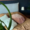 Fluwelen sierkussen. De voorkant heeft een gestikt patroon en de achterkant is effen fluweel.
