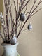 Paasslinger met eitjes, vieren en houten figuren van kip, paashaas en bloem.
